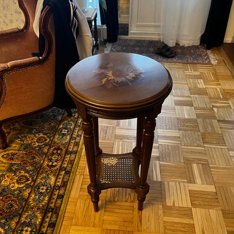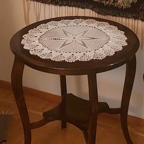 Pyöreä puinen sivupöytä kukkakoristeella