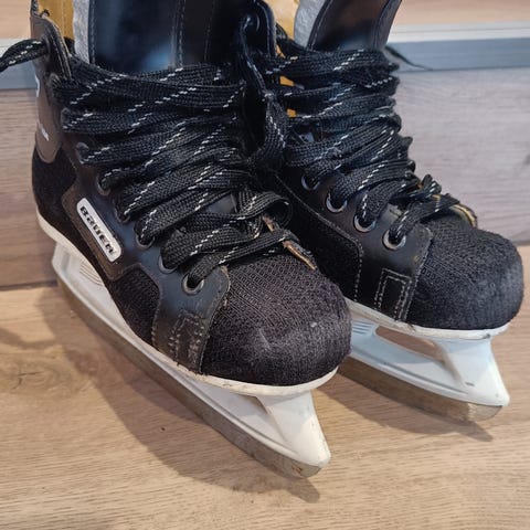 Bauer Vapor lasten jääkiekkoluistimet, koko 32. Päällisin puolin kulumaa jääkiekon peluusta, sekä kengässä normaalit säärisuojien kuluttamat reiät. Ei vaikuta käyttöön.