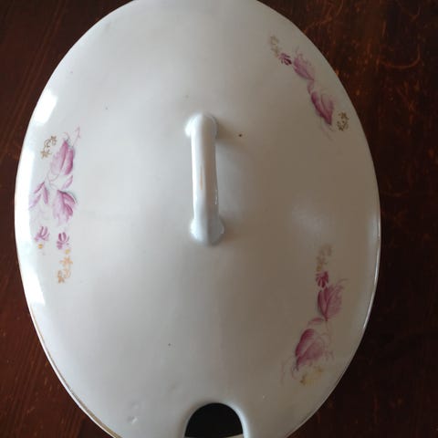 Antiikkinen posliininen voirasia kannella.