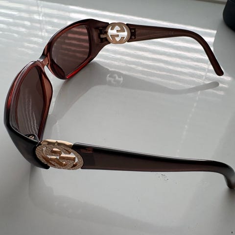Gucci aurinkolasit naisille. Suorakulmainen kehys, kullanvärinen muovirunko ja ruskeat liukuvärjätyt linssit. Mukana kovakotelo, jossa Gucci-logo kannessa. Sopivat arki- ja vapaa-ajan käyttöön auringonsuojaksi ja tyylilliseksi asusteeksi.