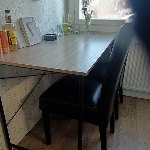 Neliönmuotoinen pöytä, jossa on puunvärinen kansi ja valkoiset jalat. Pöydän kansi on massiivipuun tai puuviilun näköinen, ja jalat ovat suorat, kulmikkaat ja irrotettavat. Sopii esimerkiksi keittiöön, ruokailutilaan tai pieneen oleskelutilaan ruokapöydäksi tai työskentelypöydäksi. Pöytä on suunniteltu sisäkäyttöön.