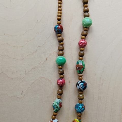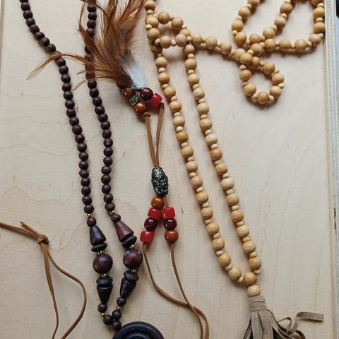 Kolme rannekorua puisista helmistä.