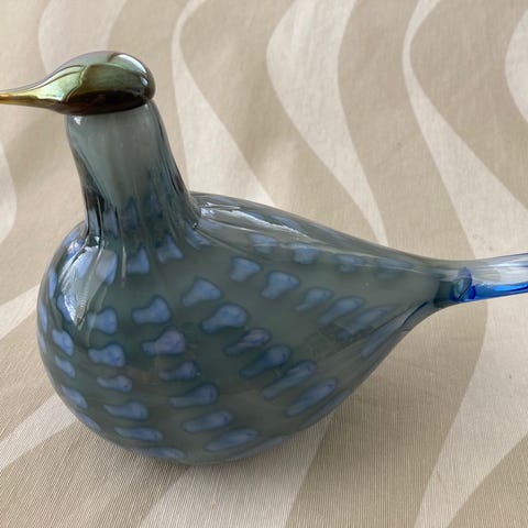 Myydään Oiva Toikan Nuutajärvelle suunnittelema sininen yrityslintu ”Sinikki”. Lintu on valmistettu vuonna 2002.