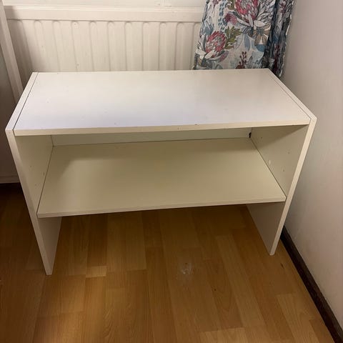 Kolmitasoinen hylly, mustilla yksityiskohdilla