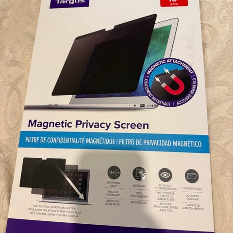 Targus kannettavan tietokoneen äytön yksityisyyssuoja. Ollut käytössä 2019 mallin 13” MacBook Prossa ja 2025 mallin 13,6” MacBook Airissa (M4) eli sopii kumpaankin.