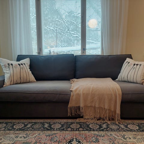 Vuodesohva ja päiväpeitto muuton tieltä, nopea nouto. Patjan pituus levitettynä 196 cm, sohvan leveys 168 cm. Syvyys suljettuna 81 cm.