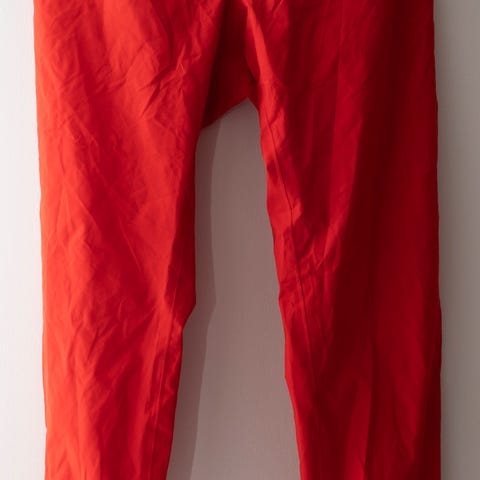 Uudet punaiset sadehousut. Movement session. M. Polyamidi. Kirkkaanpunaiset. Lahkeet avattavissa noin 45 cm:n matkalta vetoketjulla. Vetoketjut saa edelleen tarranauhoilla piiloon ( kuvat). Lahkeen sivuissa heijastimet. Vyötäröllä rypytys ja naru. Uudet ja käyttämättömät.
