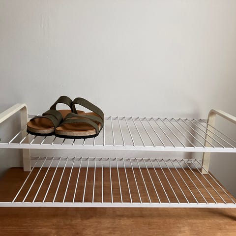 Metallinen kenkähylly. Hylly koostuu kahdesta metallisesta ritilätasosta.