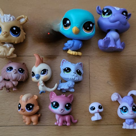 Littlest Pet Shop lelukokoelma, jossa useita pieniä eläinhahmoja. Kokoelmaan kuuluu erilaisia eläimiä, kuten kissoja, koiria, apinoita, pupu ja muita eläinhahmoja. Lelut ovat muovisia ja tarkoitettu lasten leikkeihin.