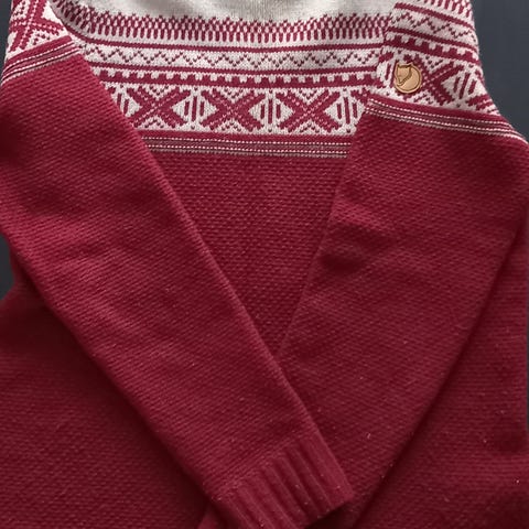 Fjällräven villaneule, koko XL. Naisten malli, jossa V-pääntie ja pitkät hihat. Neule on valmistettu villasta ja väriltään violetti. Hihassa on Fjällräven-logo. Sopii arki- ja vapaa-ajan käyttöön viileämpiin säihin.