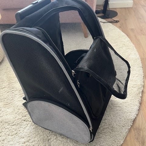 Sopii alle 7 kg painoiselle koiralle. Tämä laukku sopii käsimatkakatavaraksi lentokoneessa. Laukun mitat 55x23x40