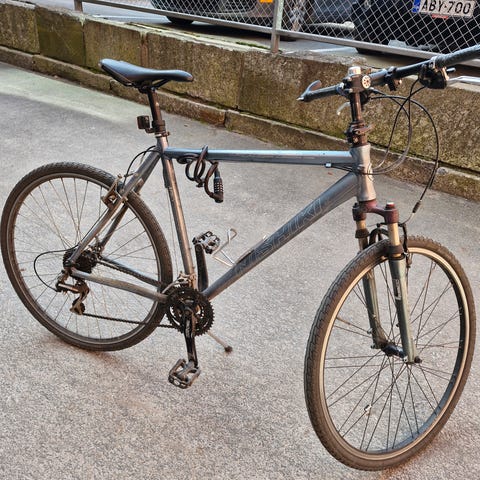Kuvien mukainen maastopyörä. Alla uudenveroiset nastarenkaat ja mukaan kohtalaiset kesärenkaat. Lähiaikoina napoja rasvailtu, ketjut ja jarrupalat vaihdettu ja säädetty vaihtimet. Jokin yksittäinen vaihde ei tainnut toimia, muuten kelaa hienosti läpi. Takapakka kulunut.