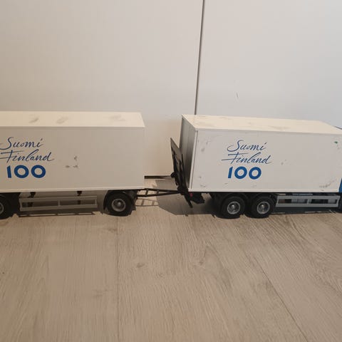 Hieno ja hyvä kuntoinen Scanian lelu rekka johon mukaan tulee perävaunu ja puita