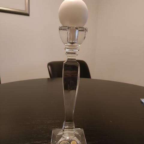 Lasinen kolmiosainen kynttilänjalka kristallikoristeilla. Kynttilänjalassa on keskijalka ja kaksi sivuhaaraa, joissa jokaisessa on maljamainen pidike sekä riippuvia koristeprismoja. Sopii esimerkiksi pöytä- tai juhlakoristeeksi kruunukynttilöille tai vastaaville kapeille kynttilöille.
