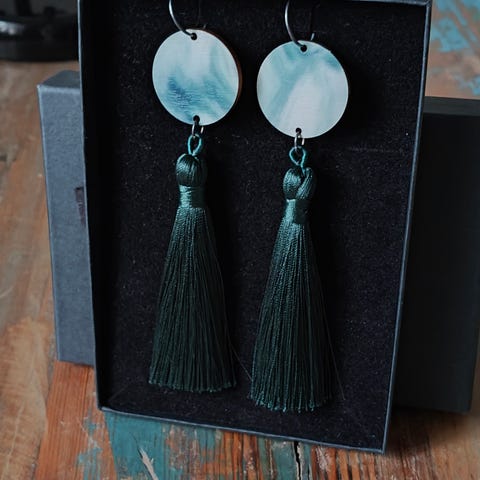 Uhanan puiset Friends-korvakorut, värit tummanvihreä ja vaaleanpunainen. Muutaman kerran käytetyt
