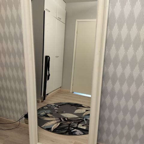 Jysk kokovartalopeili kaarevalla yläosalla ja kapealla kultaisella kehyksellä. Peili on tarkoitettu lattialle tai seinää vasten nojaavaksi ja sopii esimerkiksi makuuhuoneeseen, eteiseen tai pukeutumistilaan. Kehys on metallinen tai metallinhohtoinen ja väriltään kullan sävyinen. Muoto on suorakulmainen kaarevalla yläreunalla, mikä antaa peilille pehmeän ilmeen ja sopii monenlaiseen sisustukseen.