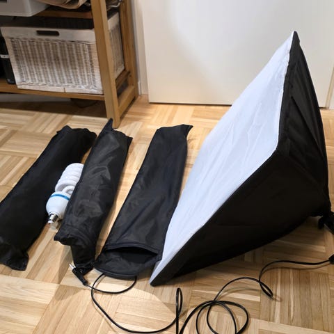 Pakkaus sisältää kaksi säädettävää jalustaa, kaksi softboxia, kahdeksan 45 W:n polttimoa ja kantolaukun (kaikki näkyvät kuvassa).