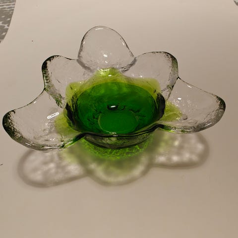 Muotoilija Pertti Santalahden 1970-luvulla Humppilan lasitehtaalle suunnittelema Kivi-Set-sarjaan kuuluva pieni kulho.