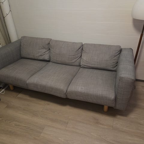 Hyvässä kunnossa oleva sohva muutoin, mutta pinta on nyppyyntynyt (näkyy kuvassa) ja jotakin pieniä huomaamattomia jälkiä voi olla havaittavissa. Merkki on Hakola.