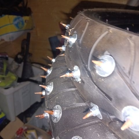 Parhaat päivänsä nähneet piikkirenkaat. Etunen 21 ja kaksi takasta 18 tuumaa. Takasista melkein kaikki piikit poikki keskeltä, etunen parempi. Kaikki kerralla, vain nouto.