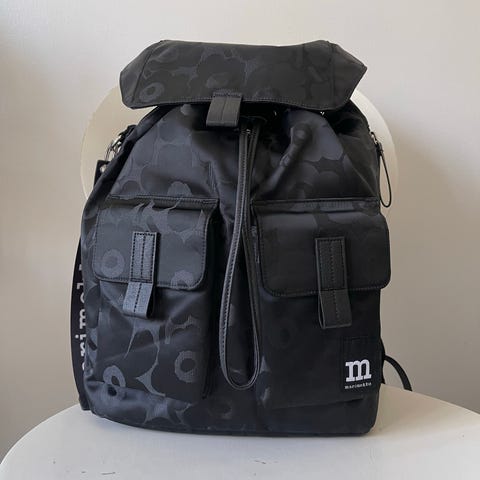 Ostin 230€ Marimekko reppu unisex-käyttöön. Ruskea kangasreppu, jossa Marimekon kukkakuosi ja musta Marimekko-logolla varustettu hihna sivussa. Repussa on vetoketjullinen päätasku, edessä vetoketjullinen etutasku sekä pehmustetut olkahihnat. Materiaalina kestävä kangas, sopii arkeen ja vapaa-aikaan.
