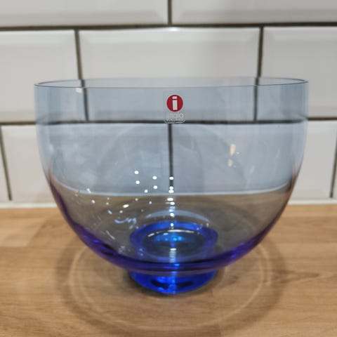 Kerttu Nurmisen Iittalalle suunnittelema Rondo lasimalja. Väri sininen ja on erittäin ohutta lasia. Korkeus 15,5cm, halkaisija 18,8cm. Virheetön kunto