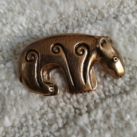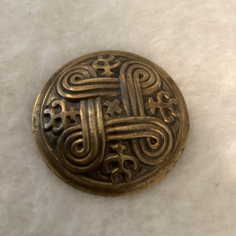 Hannunvaakuna on ikivanha kuvio, joka suojelee kantajaansa kaikelta pahalta ja karkottaa pois ikävät ajatukset. Pyöreän rintakorun halkaisija 30 mm. Pronssia.