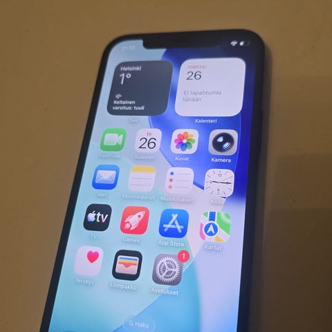 Apple iPhone 12 älypuhelin, tallennustila 64gb, puhelin kohtalaisessa kunnosss näyttö ehjä Ei säröjä, mutta pieniä naarmuja kyllä puhelin toimii on muuten kunnosss mutta kaiuttimen mennyt maalia, ei estä käyttöä eikä häiritse kaikki toimii niinkun pitää mut kaiutin reiässä on vähän koventunutta maalia, tämä kaikki hinnassa huomioitu tärkein unohtu eli akun kunto on 85.%