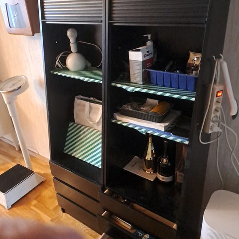 Runko ja 5 hyllyä. kiinnitys kaapin pohjaan ja kattoon. Ovi ruuveilla kiinni valmiisiin kiinikkeisiin. Nykyovi 175 cm korkea ja 40 cm leveä. Syvyyttä hyllyillä 50 cm