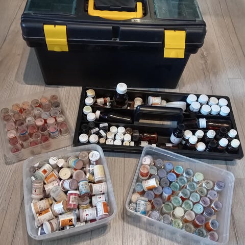 Erä posliini maalaukseen jauhevärejä, 13 eri väriä , vähän käytettyjä + öljyjä; 4 melko täysinäistä pulloa. Hinta 15 € + postikulut.