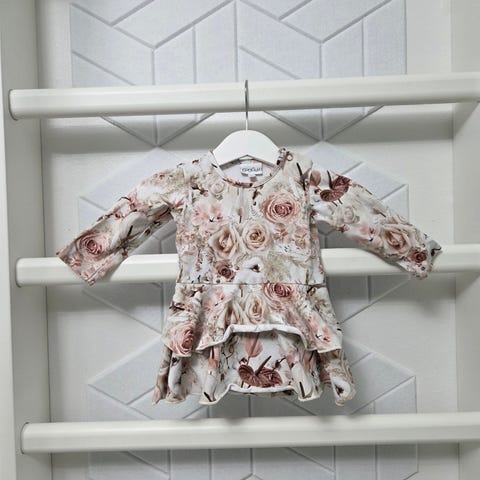 Ihana Guugguun bambikuvioinen frillamekko, vaaleanpunasävyinen. Vastaa kokoaan 68, mutta voi käyttää hyvin myös isommassa koossa, on bodymekko, haaroissa napit, kunto hyvä.