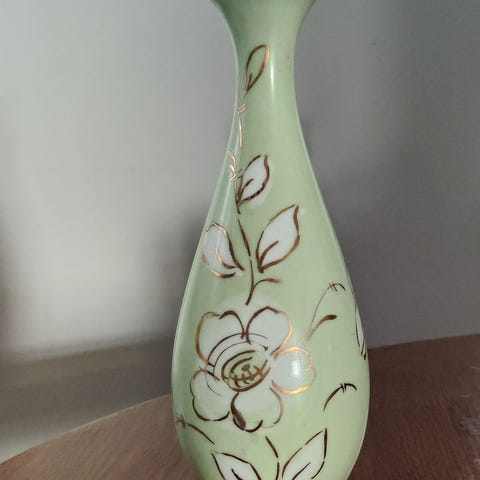 Arabia maljakko, jossa kukkakuviointi kyljissä. Valkoisella pohjalla on monivärinen kasviaiheinen koristelu. Pohjassa käsin kirjoitettu Arabia Finland -merkintä. Sopii kukkamaljakoksi tai sisustusesineeksi.