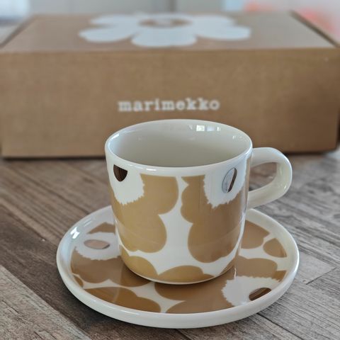 Marimekko Oiva Unikko mukisetti. Keraamiset mukit, joissa keltainen Unikko-kuvio ja valkoinen sisäpinta. Mukit soveltuvat kuumille ja kylmille juomille arki- ja kattauskäyttöön. Astiat ovat konepesun, uunin, mikron ja pakastimen kestäviä valmistajan merkintöjen mukaan. Myydään alkuperäisessä pakkauksessa 4 mukin settinä kuvien mukaisesti.