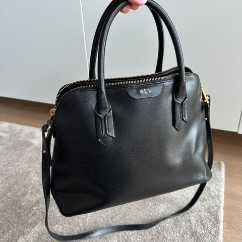 Ralph Lauren käsilaukku naisille. Materiaalina on musta tekonahka, jossa on hienoinen pintakuviointi. Laukussa on kaksi pitkää kantohihnaa olalla tai kädessä kantamiseen. Yläreunassa on vetoketjusuljenta. Sisäpuoli on vaalea ja siinä on avotasku pientavaroille. Ulkopuolella on suuri avotasku takapuolella sekä metalliset jalat pohjassa. Laukussa on kullanvärisiä metalliyksityiskohtia ja pieni logomerkki edessä.