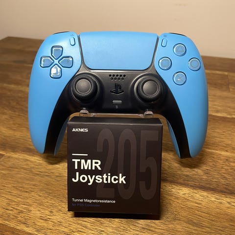 PS5 DualSense -ohjain, johon vaihdettu Aknes TMR joystickit.