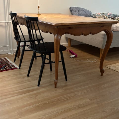 Puu ruokapöytä, jatkettava malli tummanruskealla viimeistelyllä. Pöydässä on kääntyvät jatkolevyt, joiden avulla pöydän kokoa voi muuttaa tarpeen mukaan. Pöytälevy on suorakaiteen muotoinen ja sen pinnassa on käytön jälkiä ja värimuutoksia. Jalustassa on sorvatut, kierteiset jalat ja tukevat poikkipuut. Sopii ruokapöydäksi tai sivupöydäksi esimerkiksi olohuoneeseen tai keittiöön.
