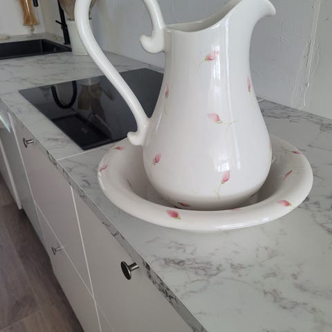 Ihanat Englantilaista porsliinia,vati ja kannu. Kuin uudet,ei mahdu uuteen kotiin. Vati n.25 cm.halk. ja kannu n.18 cm.kork. Hinta yht.25 €.