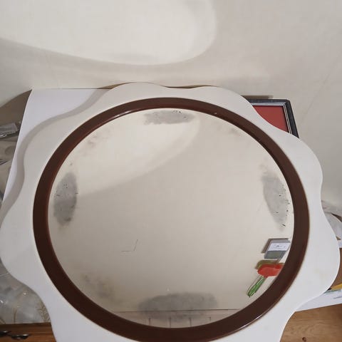 Kotimainen retropeili. Kunnossa ei moitteita. Lämmin valkoinen maalipinta kehyksissä. Peililasi ehjä.