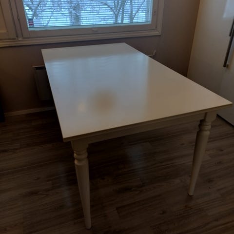 Erittäin hyvässä kunnossa oleva Jyskin Jegind ruokapöytä (valkoinen, tammi). Vain nouto ja omat kantajat mukaan. Korkeus 75 cm ja halkaisija 105 cm. Pöytä ei uudelle häpeä, myyn äitini puolesta. Ovh 139 eur.