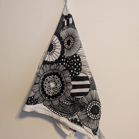 Kerran käytetty ja pesty musta-valkoinen pyyhe, käytetty miedosti tuoksuvaa huuhteluainetta. ToriDiili tai nouto.