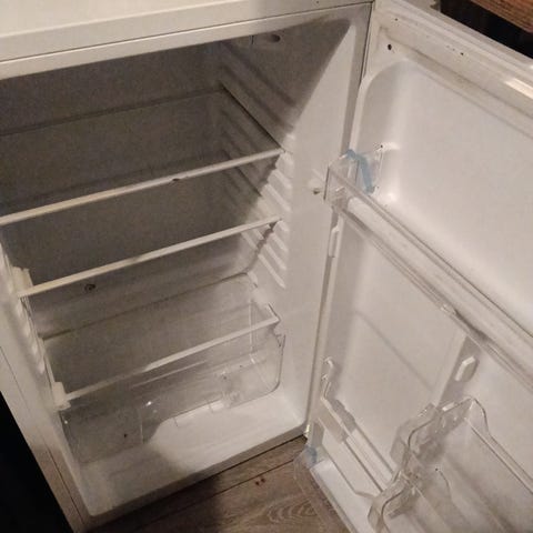 Perussiisti pieni jääkaappi pakastinlokerolla. Ollut käytössä ja nyt sulatettu ja puhdistettu.