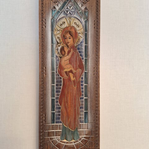 Puuveistoksen pituus on n. 46,8 cm ja maks. leveys on n. 13,5 cm. Taakse on kirjoitettu teksti: ORIGINAL J. PINA. Voin lähettää postipakettina.