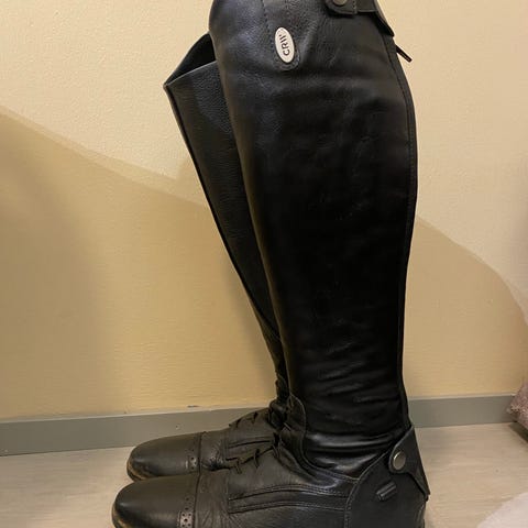 Nahkaiset mustat ratsastussaappaat kumipohjalla. Korkeavartinen malli, jossa nauhoitus jalkaterän päällä ja sileä varsi. Vetoketju takana. Sopivat mm. ratsastukseen ja tallikäyttöön. Koko 45 - 46 sopivat jalkaan... 29 cm