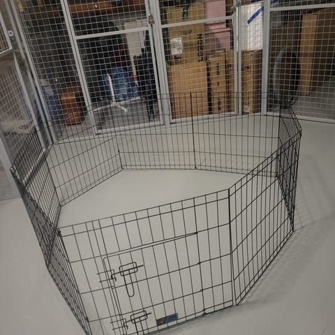 Metallinen koira-aitaus, joka koostuu useasta yhteen liitettävästä paneelista. Aitaus on kokoontaitettava ja sen voi muotoilla eri muotoihin, esimerkiksi monikulmioksi. Yhdessä paneelissa on ovi, jossa on lukittava salpa. Sopii koirien tai muiden pienten lemmikkien tilapäiseen rajaamiseen sisätiloissa tai vastaavissa olosuhteissa.koko 370cm×67cm. Vain haku.