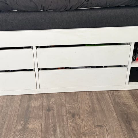 IKEA sänky säilytyslaatikoilla. Sängyn alla on kaksi vedettävää laatikkoa, jotka tarjoavat lisäsäilytystilaa esimerkiksi vuodevaatteille tai muille tavaroille. Rungossa on valkoinen kehys ja tummat laatikon etupaneelit. Yhdessä reunassa on pieni kolhu, joka näkyy kuvassa.