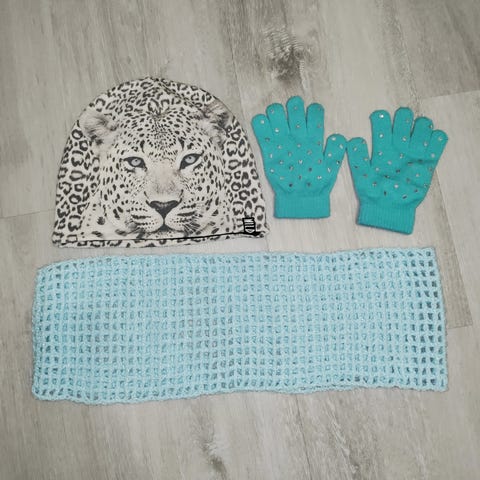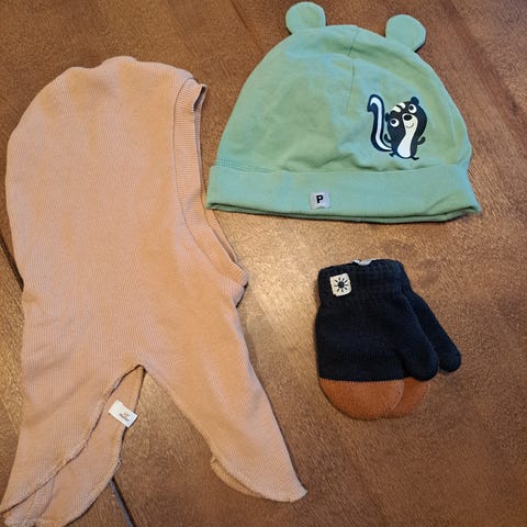 Lasten vaatesetti,jossa neuletakki,hame ja pipo hempeissä väreissä,joita vaikea saada kuvatuksi.Koko merkinnät puuttuu,joten voisin luulla,että 1-1,5 v tytölle.