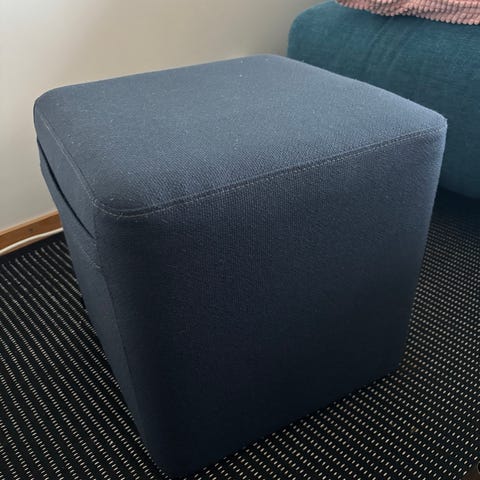 Käsityönä tehty rahi. Pehmustettu kangaspäällysteinen istuinosa. Oikeaa puuta, irtonainen kansiosa.