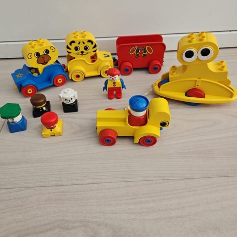 Harvinainen Lego Duplo 7-osainen rakennuslelu, jossa sininen rakennusalusta ja värikkäitä palikoita hahmon kokoamiseen. Mukana on myös erillinen punainen Duplo-helistinlelu, jossa on kahvat ja pyörivä sininen pallo keskellä. Sopii yhteensopivaksi muiden Lego Duplo -palikoiden kanssa ja tukee pienten lasten rakentelu- ja hahmotteluleikkejä.
