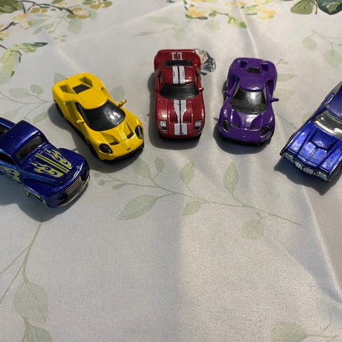 5 kpl pikkuautoja Ferrari, Ford, Mercedes, Porsche