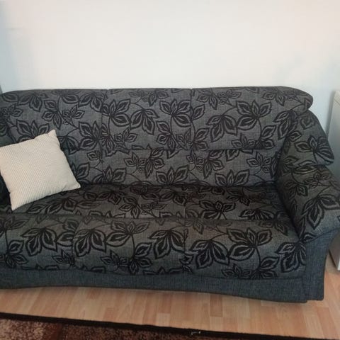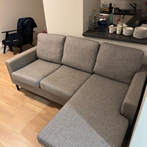 sohva, kulmamalli. Vaaleanharmaa verhoilu ja useita irrallisia selkä- ja istuintyynyjä. Sohva sopii useamman henkilön istumiseen ja olohuonekäyttöön. Materiaalista ja tarkasta koosta ei ole lisätietoja.ei siis mikään priima nouto heti
